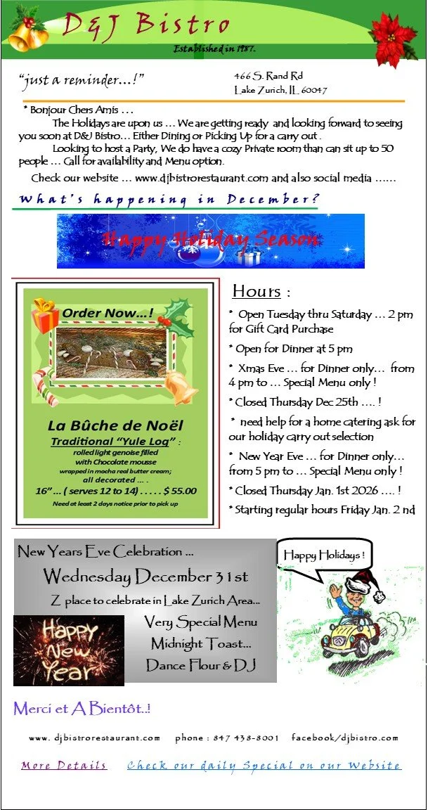 December Holidays Season Monday, December 1, 2025 8:00 AM Thursday, January 1, 2026 2:00 AM D&J Bistro 466 South Rand Road Lake Zurich, IL, 60047 United States (map) Google Calendar ICS